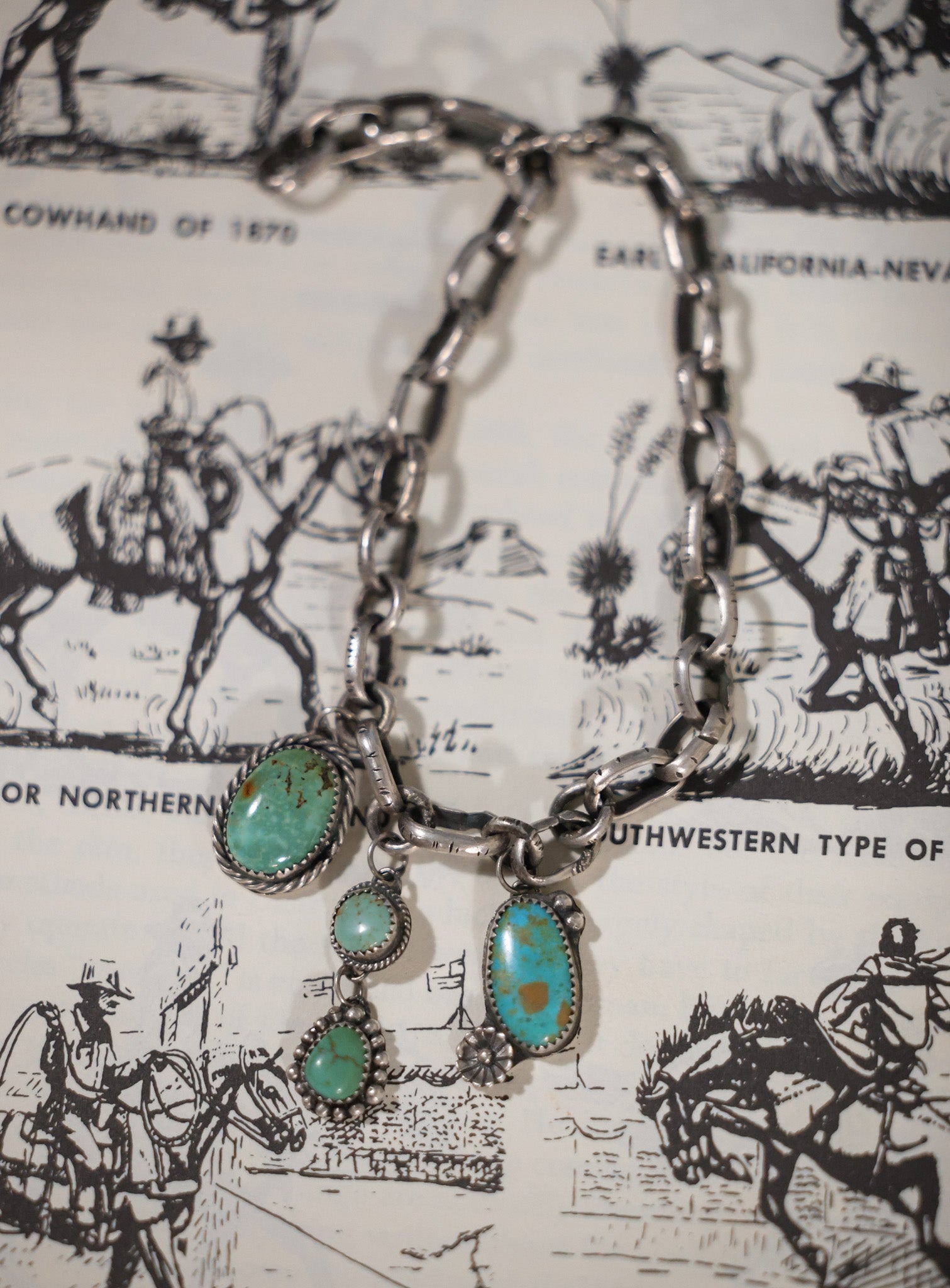 3 charms including Sonoran Turquoise stones, handmade chain with clasp. This bracelet is a hefty lady so if you like a chunky chain this is for you!!